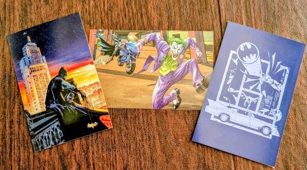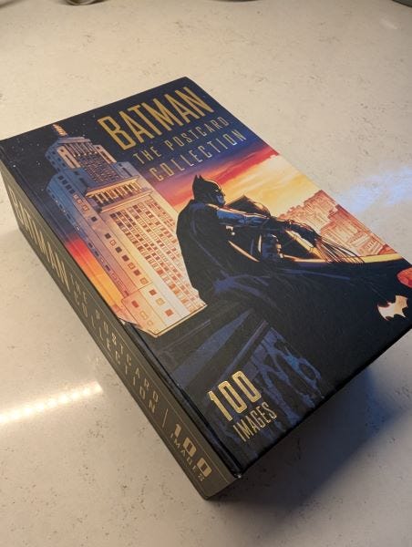 Her brother, my four-year-old grandson, could not be left out, so I tapped into his current passion: Batman. You can find just about anything in online stores now, and I hit the jackpot: a boxed collection of 100 Batman postcards in a beautiful cardboard keepsake box. I understand from his dad that they are a hit with my little Caped Crusader! He feels very special, getting one per day from "Gigi"--my grandma name--out of the mailbox when he gets home from preschool.