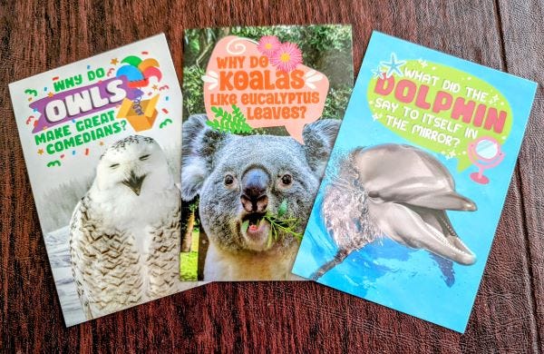 Currently, my almost-ten-year-old granddaughter is at a two-week summer camp. She liked the postcards I sent her there last year, so I decided to make it a tradition. I found some fun Animal Joke postcards online and snapped them up. I sent seven to her, one per day, starting last weekend, so they would all be sure to arrive during her stay. There are many left, so I plan to send a steady stream of them to her at home to continue our fun.